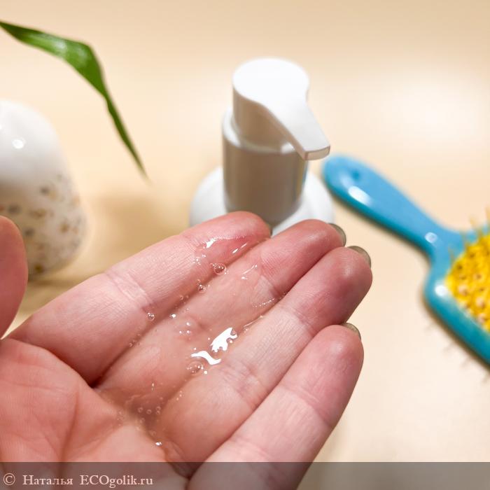 Шампунь имеет гелевую текстуру, у него консистеция средней густоты и плотности с небольшим оттенком. Он не сильно текучий. Средство быстро смывается с волос, не пересушивая и не спутывая пряди. Шампунь не жидкий, но и не сильно густой.