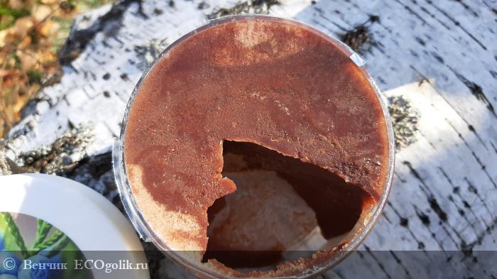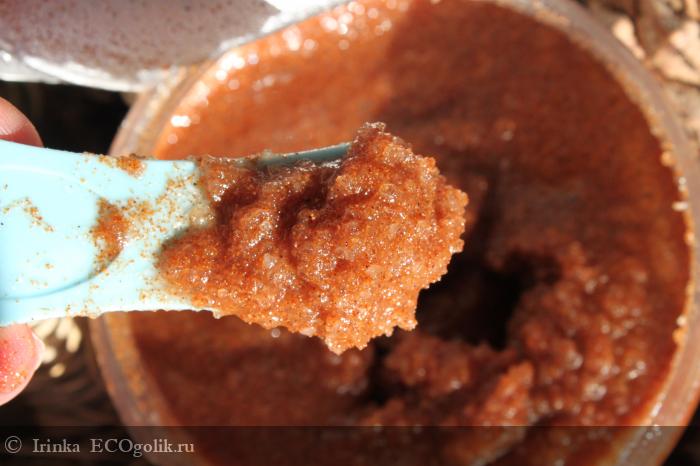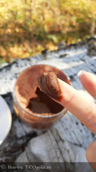 Скраб представляет собой густую кашицеобразную консистенцию ярко-коричневого цвета с скрабирующими частичками из скорлупы орешков.
