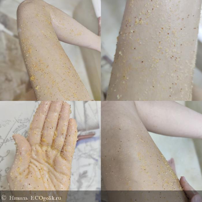Соль-скраб хранится в пластиковой баночке в объёме 250 мл, которая закрывается матовой чёрной крышкой. Дизайн минималистичный. Уходовый продукт плотный, густой, оранжевого цвета. Кожу и поверхность ванны не окрашивает. Крупинки соли небольшого размера. Частички кремния и молотые абрикосовые косточки мелкие. Не царапает и не травмирует кожу. Легко распределяется по коже, не осыпается, быстро смывается с кожицы. Не вызывает покраснений, зуда, раздражения. После его смывания на коже ощущается лёгкая маслянистость, через час она исчезает. Он не засоряет слив ванны. Аромат цитрусовый, не резкий, насыщенный, остаётся на коже в течение нескольких часов после смывания средства. Отлично очищает поры. Придаёт упругость и эластичность коже. Хорошо питает. Неплохо расслабляет, когда используешь этот уходовый продукт, как солевую ванну. Убирает лёгкую оттеночность. Прекрасно смягчает, увлажняет, тонизирует. Эффективно отшелушивает, мягко, но качественно. Профилактирует врастание волос.