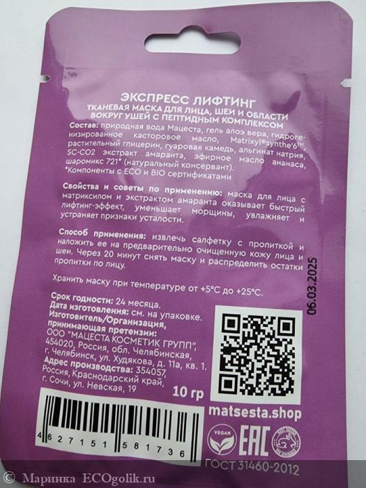 Перед выходом в люди отлично подойдет Тканевая маска Экспресс-лифтинг с пептидным комплексом от Matsesta